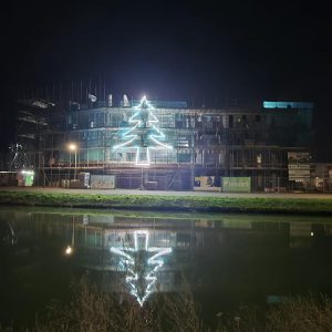 De steigers op de bouwplaats van project Douma Locatie zijn dit jaar extra feestelijk met een kerstboom van lichtjes. Niet alleen bouwen we hier aan 30 appartementen, maar ook aan warmte en verbondenheid.