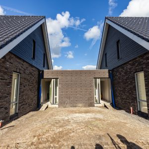 Uitvoerder Jeroen: “De woningen zijn zeer bewerkelijk in de uitvoering. Dat maakt het voor ons juist heel leuk en uitdagend. Het houtwerk, bestaande uit de overstekken, goten en de gevelbekleding aan de woningen is allemaal met de hand op maat gezaagd en aangebracht. En er zijn meer mooie details, zoals de dakkappellen en natuurlijk het metselwerk.