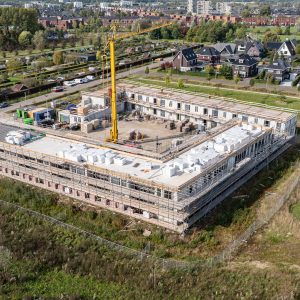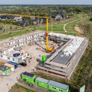 Samen met uitvoerder Maarten leert hij elke dag bij. Maarten werkt al 25 jaar in de bouw en vindt dit project een mooie uitdaging: “32 appartementen, alles dicht op elkaar. Balkonplaten, galerijplaten – als timmerman deed ik dat veel, maar als uitvoerder nog niet.”