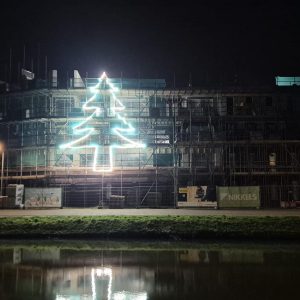 De steigers op de bouwplaats van project Douma Locatie zijn dit jaar extra feestelijk met een kerstboom van lichtjes. Niet alleen bouwen we hier aan 30 appartementen, maar ook aan warmte en verbondenheid.