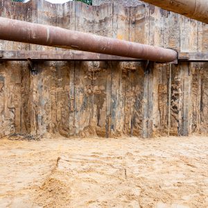 Om de damwanden op hun plek te houden, zijn grote stalen schoren aangebracht. De langste schoor is maar liefst 27 meter lang en weegt 7.000 kilo. Alle buizen hebben een diameter van 80 cm, een knap staaltje techniek.