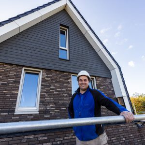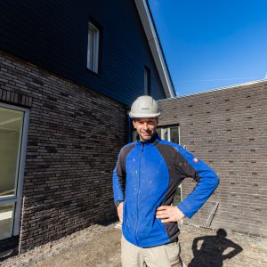 Uitvoerder Jeroen: “De woningen zijn zeer bewerkelijk in de uitvoering. Dat maakt het voor ons juist heel leuk en uitdagend. Het houtwerk, bestaande uit de overstekken, goten en de gevelbekleding aan de woningen is allemaal met de hand op maat gezaagd en aangebracht. En er zijn meer mooie details, zoals de dakkappellen en natuurlijk het metselwerk.